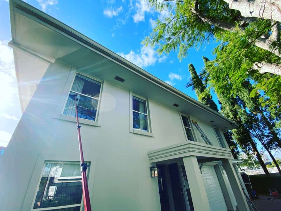 Our long-reach system keeps our team grounded, eliminating the need for ladders or scaffolding. This method is eco-friendly and free from chemicals, making it safe for the environment and leaving no residues on the windows.